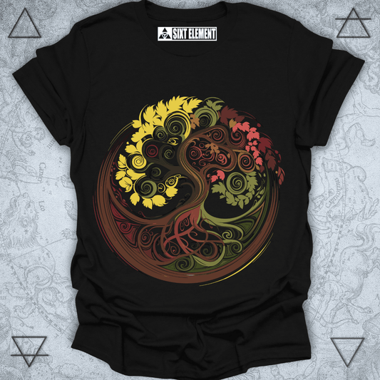 Autumn Tree of Life Premium Quality T-Shirt – Spiral Roots & Seasonal Flow